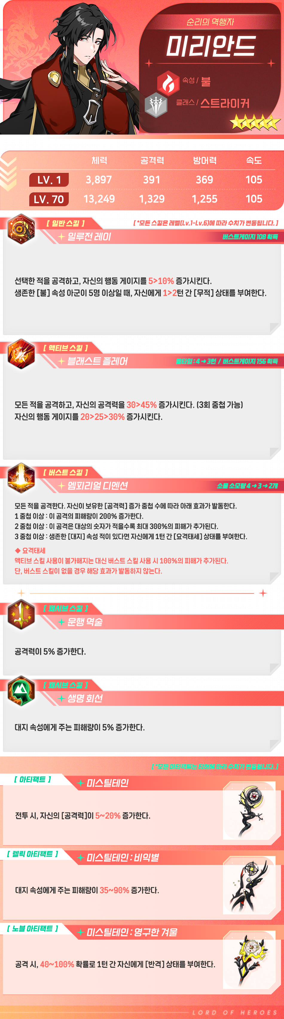 길 위에서 수많은 기술을 다듬고 자신의 정체성을 마법사가 아닌 의사로 확립한 이후, 미리안드는 두 차례 인연을 맞이했습니다. 처음은 기꺼이 성씨를 내어준 태고의 빛이자 가족, 그다음으로는 마지막 전투를 함께한 동료들이었죠. 그는 언제 어느 때나 무리에 섞이길 거부하고 제 뜻이 전부인 양 움직였지만, 그가 무엇보다 우선시한 것은 동료의 목숨이었으니 그 손길 가운데 무익한 것은 단 한 차례도 없었고요.