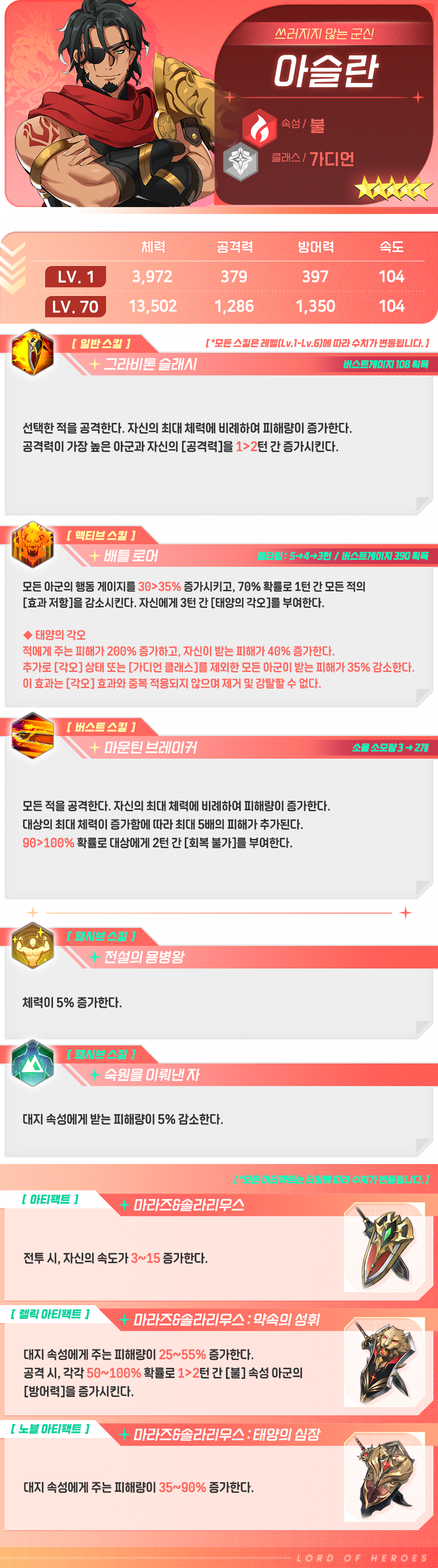 유니버스 [영웅 소개] - [불] 아슬란 GM 페르사 Read more posts by this author. GM 페르사 2025년 12월 17일 수요일 2차 마도대전에서 대활약한 전설의 용병왕. 종전 후 용병들을 모아 자신의 나라를 세웠고, 30년의 세월 동안 다케온을 통치해왔습니다. 매우 호탕한 성격으로, 약자에게는 먼저 손을 내밀며 강자에게 굽히지 않습니다.