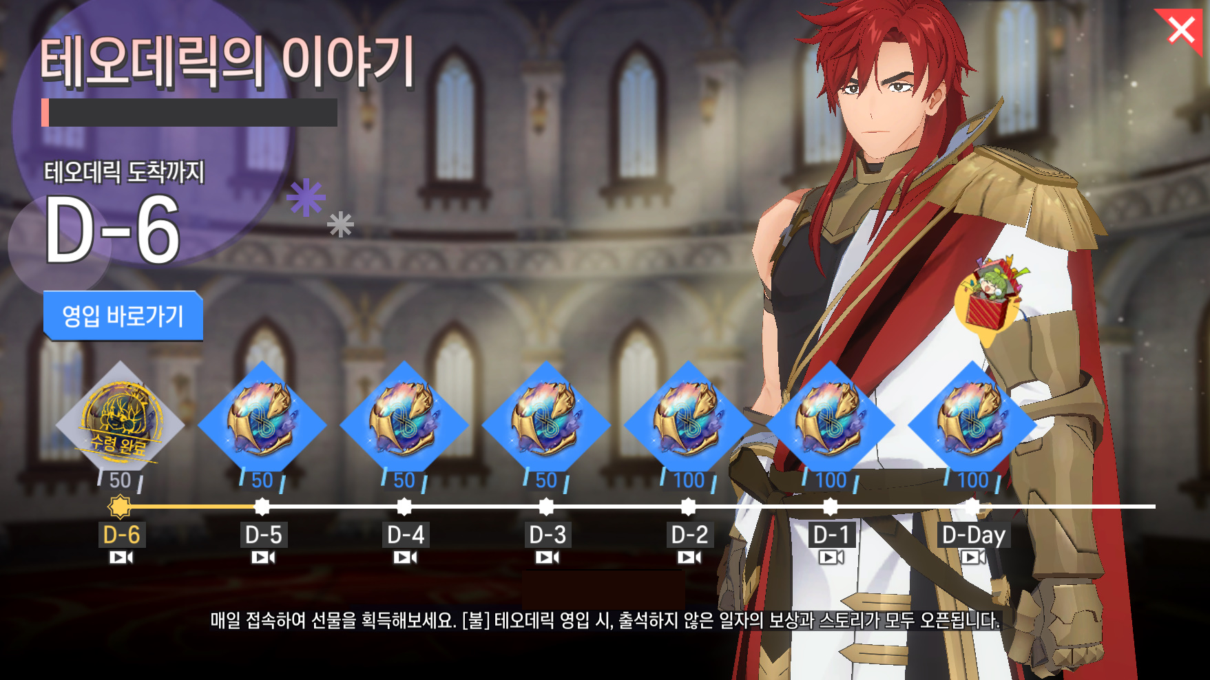 ※ 카운트 다운 출석부 종료 후에는 테오데릭을 영입해도 스토리가 오픈되지 않습니다.
